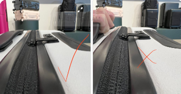 Depending on how much is packed (or previously packed into the suitcase) the sides of the suitcase may slightly misalign. In order for the zip tabs to secure themselves into the lock, both sides will need to be aligned as pictured below.